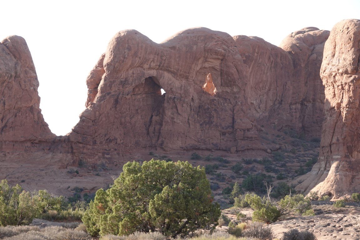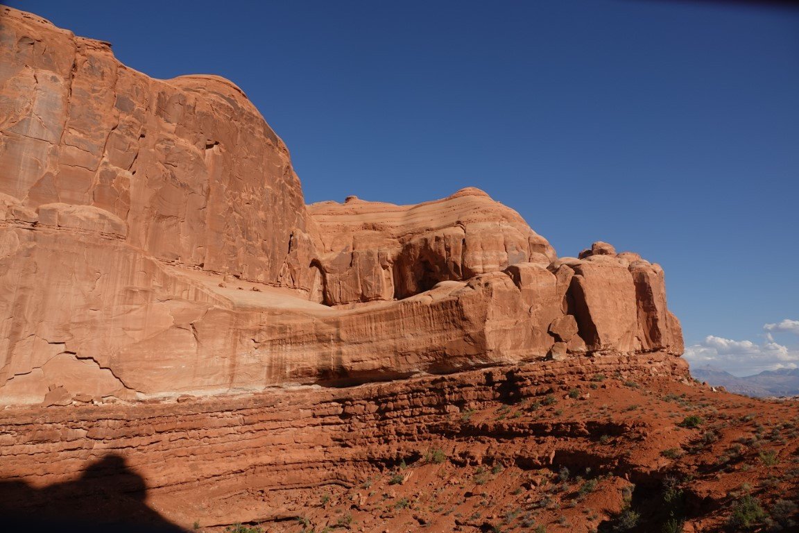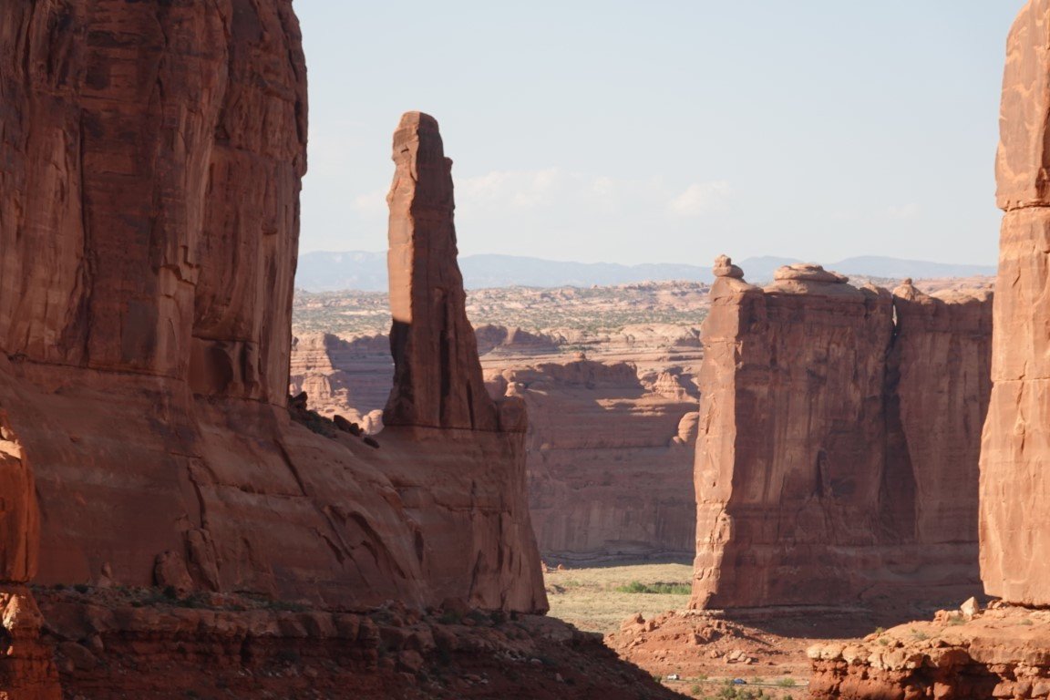 Arches National Park is a national park of the United States in eastern Utah. The park is adjacent to the Colorado River, 4 mi (6 km) north of Moab, Utah. The park contains more than 2,000 natural sandstone arches, including the well-known Delicate Arch, which constitute the highest density of natural arches in the world. It also contains a variety of other unique geological resources and formations.[3][4] The national park lies above an underground evaporite layer or salt bed, which is the main cause of the formation of the arches, spires, balanced rocks, sandstone fins, and eroded monoliths in the area. The park consists of 310.31 km2 (76,680 acres; 119.81 sq mi; 31,031 ha) of high desert located on the Colorado Plateau.[5] The highest elevation in the park is 5,653 ft (1,723 m) at Elephant Butte, and the lowest elevation is 4,085 ft (1,245 m) at the visitor center. The park receives an average of less than 10 in (250 mm) of rain annually. Administered by the National Park Service, the area was originally named a national monument on April 12, 1929, and was redesignated as a national park on November 12, 1971