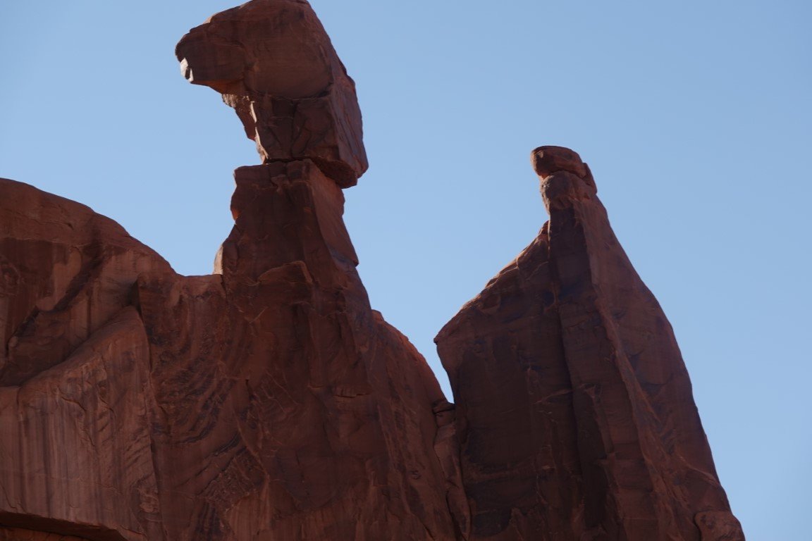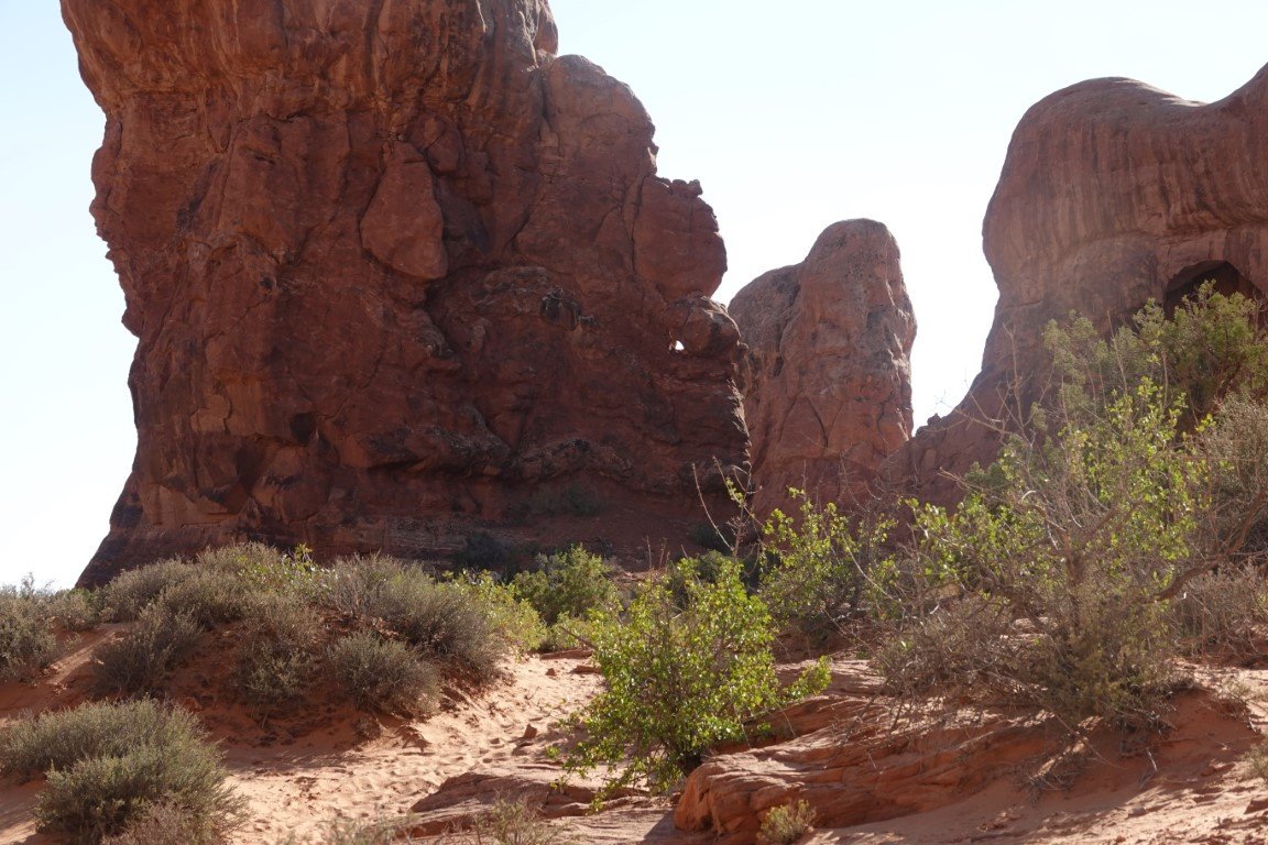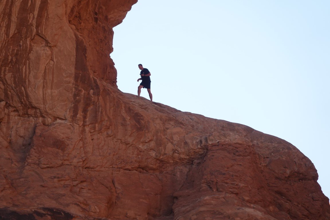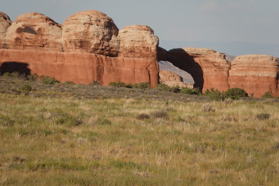 Arches National Park is a national park of the United States in eastern Utah. The park is adjacent to the Colorado River, 4 mi (6 km) north of Moab, Utah. The park contains more than 2,000 natural sandstone arches, including the well-known Delicate Arch, which constitute the highest density of natural arches in the world. It also contains a variety of other unique geological resources and formations.[3][4] The national park lies above an underground evaporite layer or salt bed, which is the main cause of the formation of the arches, spires, balanced rocks, sandstone fins, and eroded monoliths in the area. The park consists of 310.31 km2 (76,680 acres; 119.81 sq mi; 31,031 ha) of high desert located on the Colorado Plateau.[5] The highest elevation in the park is 5,653 ft (1,723 m) at Elephant Butte, and the lowest elevation is 4,085 ft (1,245 m) at the visitor center. The park receives an average of less than 10 in (250 mm) of rain annually. Administered by the National Park Service, the area was originally named a national monument on April 12, 1929, and was redesignated as a national park on November 12, 1971