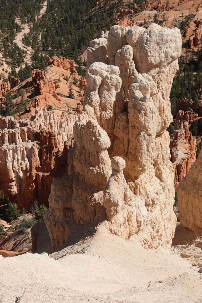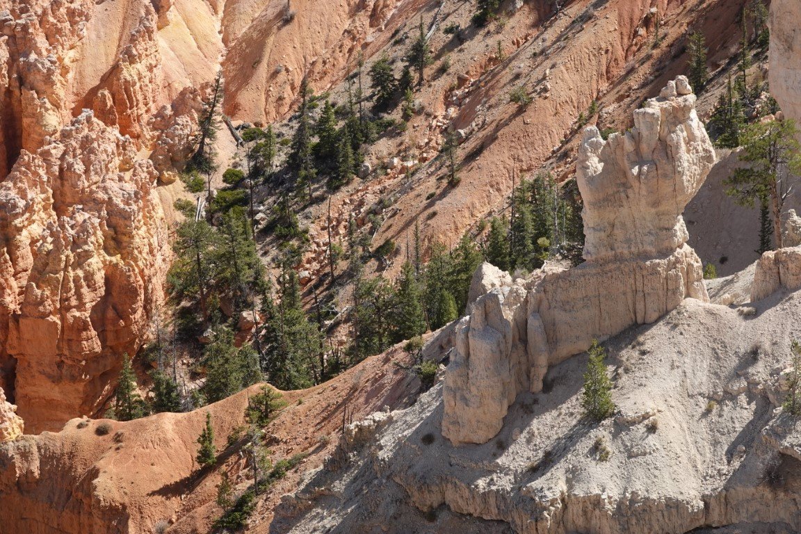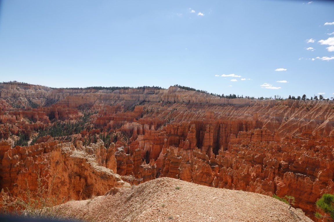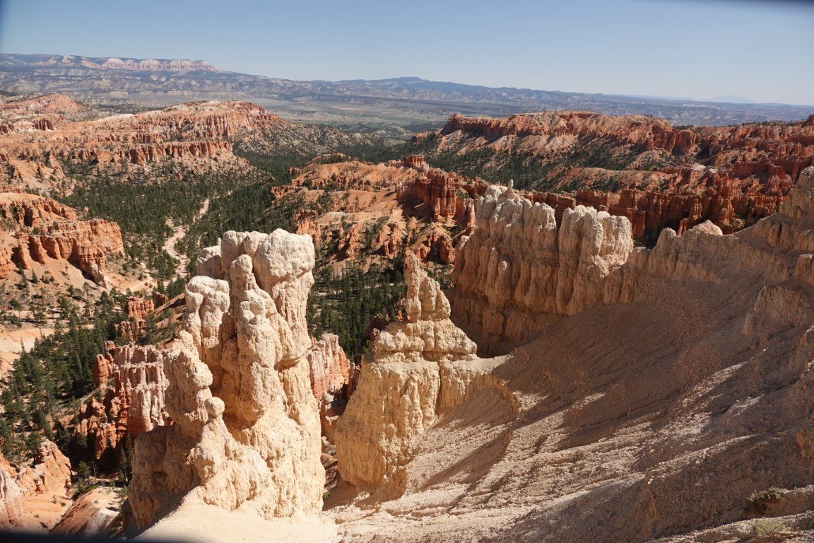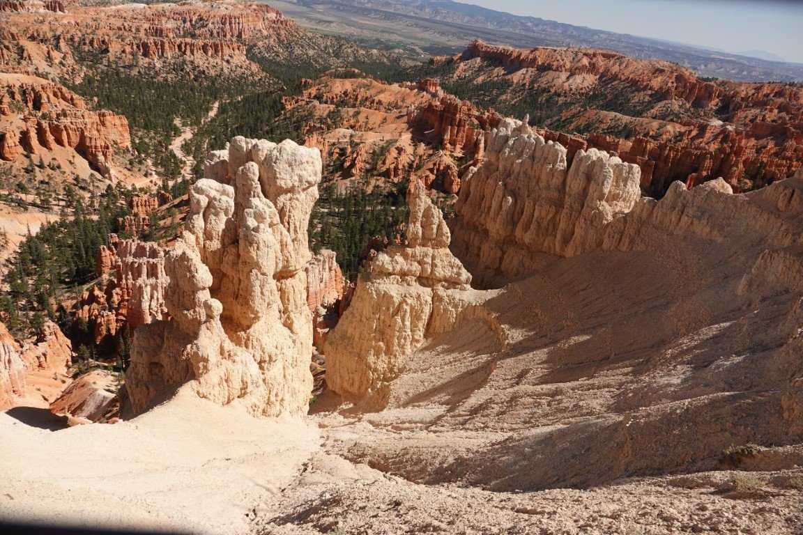 Bryce Canyon National Park (/braɪs/) is a national park of the United States located in southwestern Utah. The major feature of the park is Bryce Canyon, which despite its name, is not a canyon, but a collection of giant natural amphitheaters along the eastern side of the Paunsaugunt Plateau. Bryce is distinctive due to geological structures called hoodoos, formed by frost weathering and stream erosion of the river and lake bed sedimentary rock. The red, orange, and white colors of the rocks provide spectacular views for park visitors. Bryce Canyon National Park is much smaller and sits at a much higher elevation than nearby Zion National Park. The rim at Bryce varies from 8,000 to 9,000 feet (2,400 to 2,700 m). The area is in portions of Garfield County[3] and Kane County.[4] The Bryce Canyon area was settled by Mormon pioneers in the 1850s and was named after Ebenezer Bryce, who homesteaded in the area in 1874.[5] The area was originally designated as a national monument by President Warren G. Harding in 1923 and was redesignated as a national park by Congress in 1928. The park covers 35,835 acres (55.992 sq mi; 14,502 ha; 145.02 km2)[1] and receives substantially fewer visitors than Zion National Park (nearly 4.3 million in 2016) or Grand Canyon National Park (almost 6 million in 2016), largely due to Bryce's more remote location. In 2023, Bryce Canyon received 2,461,269
