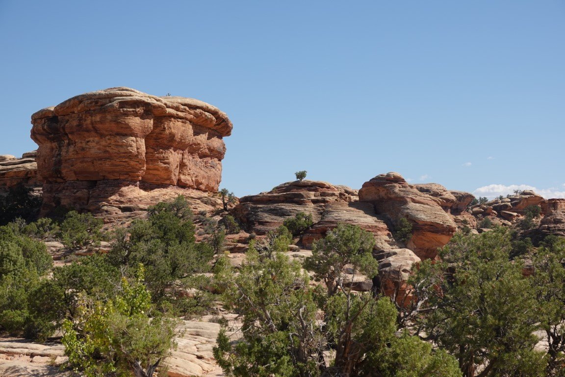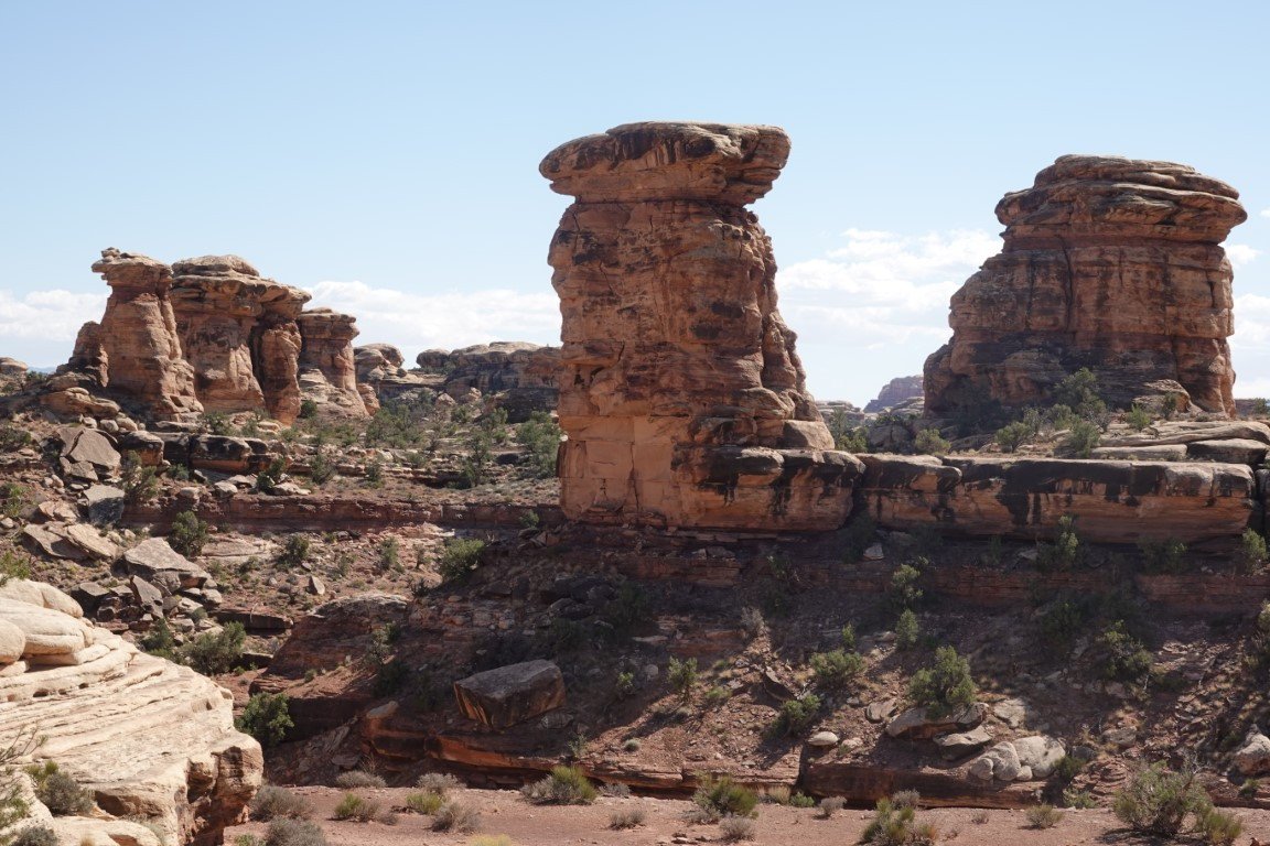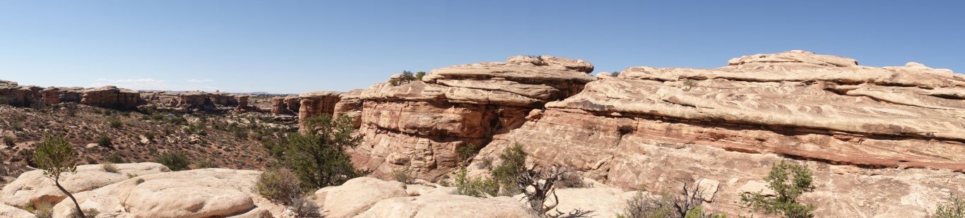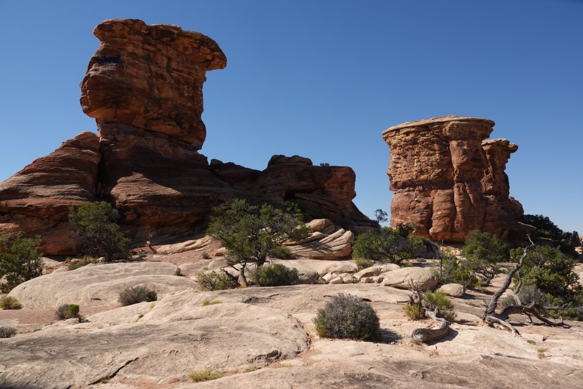 The Needles forms the southeast corner of Canyonlands and was named for the colorful spires of Cedar Mesa Sandstone that dominate the area. The Needles are tower-like hills of Cedar Mesa sandstone cut down and carved by the Green and Colorado Rivers over 20 million years ago. Water erosion caused by the flowing streams and heavy rains slowly shaped the geological features we admire today.