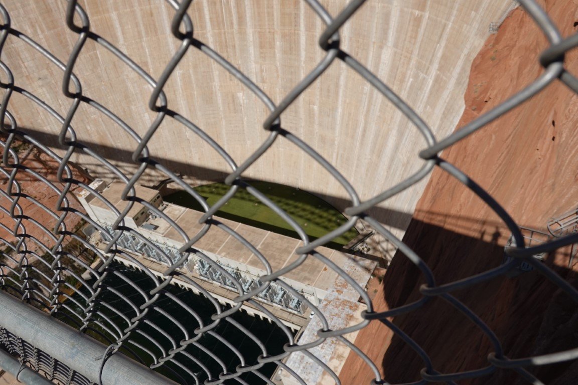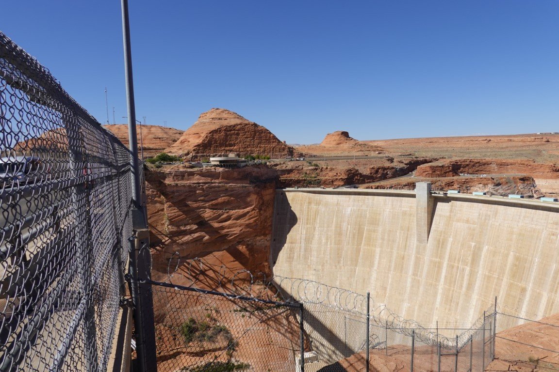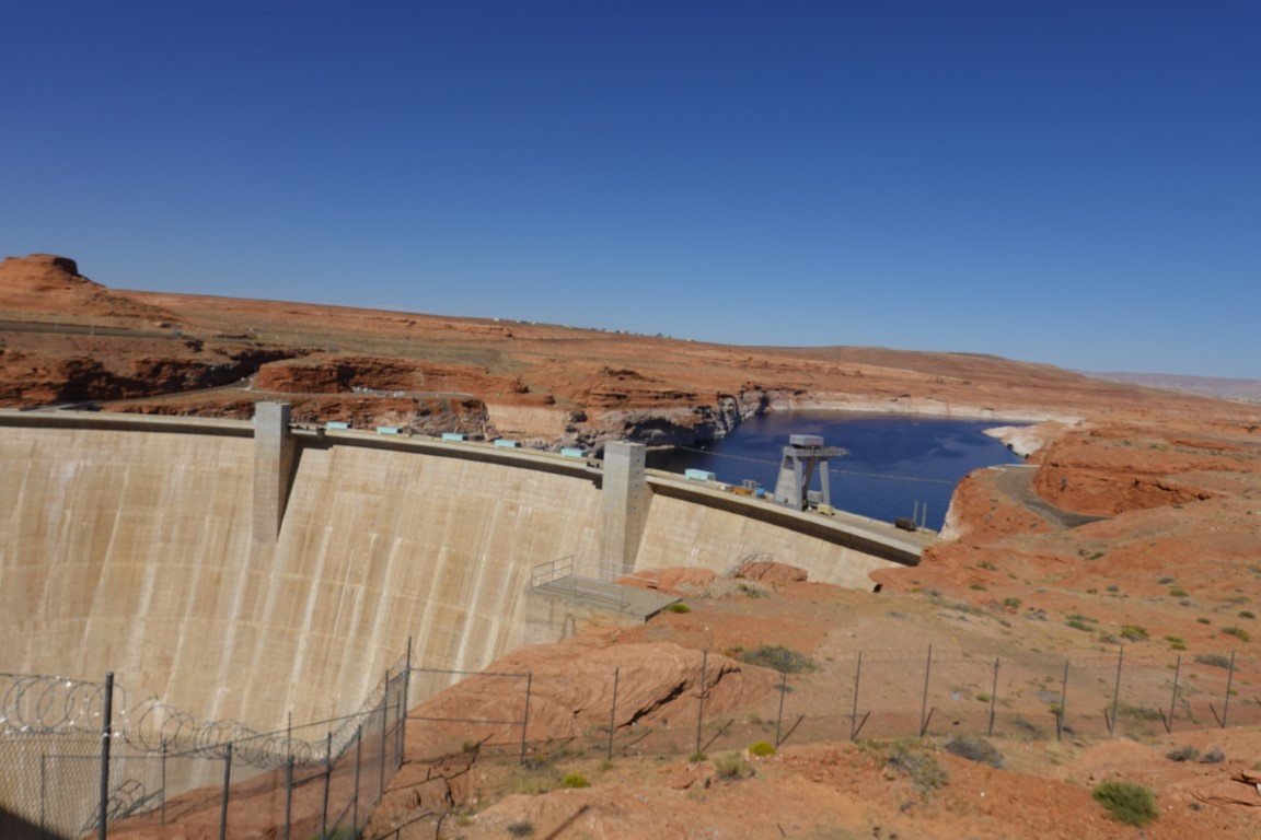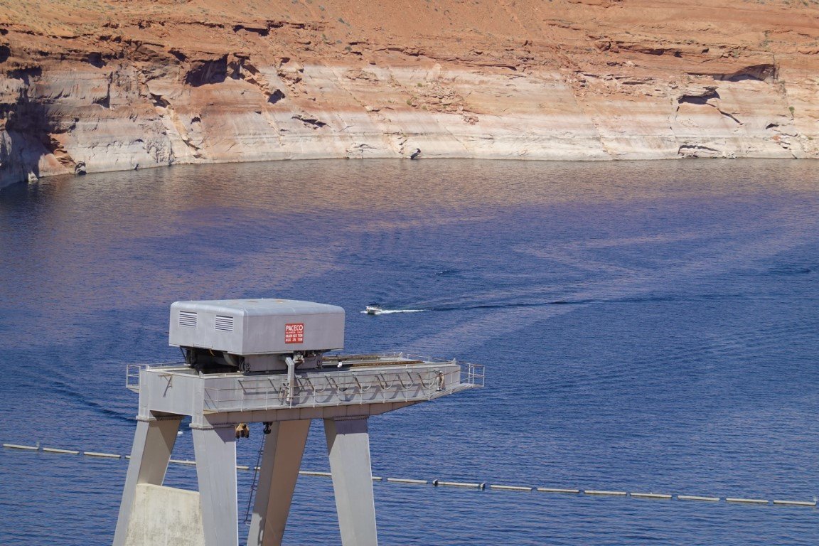 Glen Canyon Dam is a concrete arch-gravity dam in the southwestern United States, located on the Colorado River in northern Arizona, near the city of Page. The 710-foot-high (220 m) dam was built by the Bureau of Reclamation (USBR) from 1956 to 1966 and forms Lake Powell, one of the largest man-made reservoirs in the U.S. with a capacity of more than 25 million acre-feet (31 km3).[4] The dam is named for Glen Canyon, a series of deep sandstone gorges now flooded by the reservoir; Lake Powell is named for John Wesley Powell, who in 1869 led the first expedition to traverse the Colorado River's Grand Canyon by boat. A dam in Glen Canyon was studied as early as 1924, but these plans were initially dropped in favor of the Hoover Dam (completed in 1936) which was located in the Black Canyon. By the 1950s, due to rapid population growth in the seven U.S. and two Mexican states comprising the Colorado River Basin, the Bureau of Reclamation deemed the construction of additional reservoirs necessary.[8] The Glen Canyon Dam remains a central issue for modern environmentalist movements. Beginning in the late 1990s, the Sierra Club and other organizations renewed the call to dismantle the dam and drain Lake Powell in Lower Glen Canyon. Glen Canyon and Lake Powell are managed by the Department of the Interior within Glen Canyon National Recreation Area. Since first filling to capacity in 1980, Lake Powell water levels have fluctuated greatly depending on water demand and annual runoff. The operation of Glen Canyon Dam helps ensure an equitable distribution of water between the states of the Upper Colorado River Basin (Colorado, Wyoming, and most of New Mexico and Utah) and the Lower Basin (California, Nevada and most of Arizona).[8] During years of drought, Glen Canyon guarantees a water delivery to the Lower Basin states, without the need for rationing in the Upper Basin. In wet years, it captures extra runoff for future use.[8] The dam is also a major source of hydroelectricity, averaging over 4 billion kilowatt hours per year.[7] The long and winding Lake Powell, known for its scenic beauty and recreational opportunities including houseboating, fishing and water skiing, attracts millions of tourists each year to the Glen Canyon National Recreation Area.[9] In addition to its flooding of the scenic Glen Canyon, the dam's economic justification was questioned by some critics.[10] It became "a catalyst for the modern environmental movement,"[11] and was one of the last dams of its size to be built in the United States.[12] The dam has been criticized for the large evaporative losses from Lake Powell and its impact on the ecology of the Grand Canyon, which lies downstream; environmental groups continue to advocate for the dam's removal. Water managers and utilities state that the dam is a major source of renewable energy and provides a buffer for severe droughts.