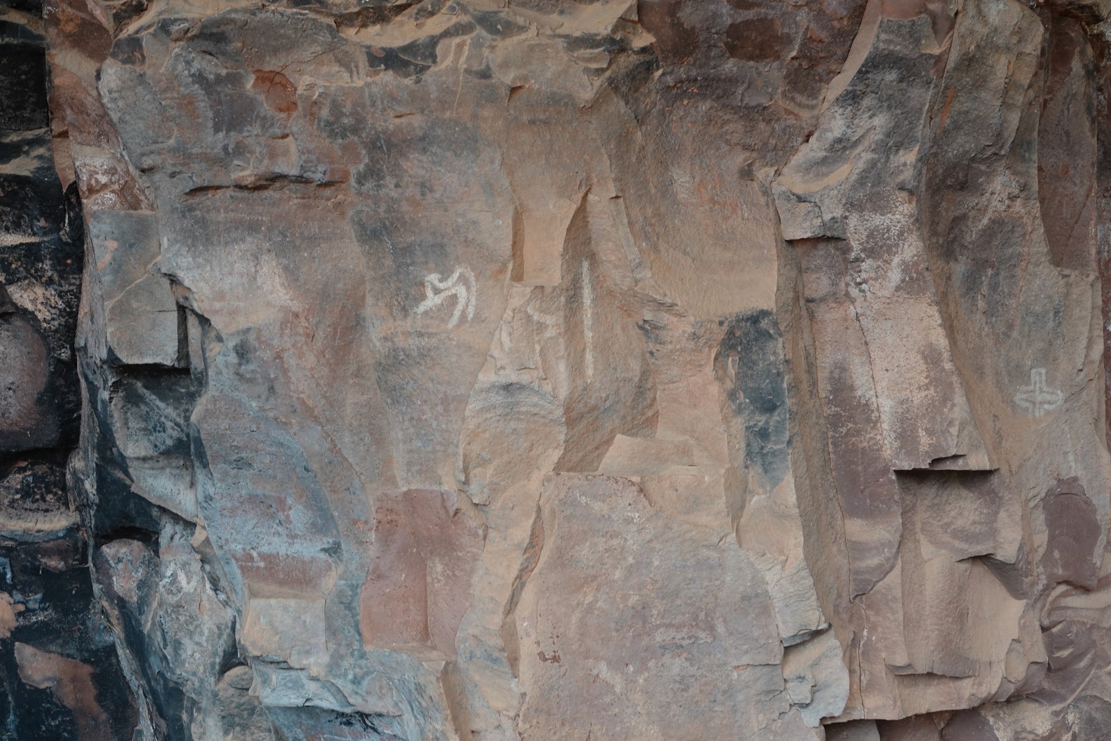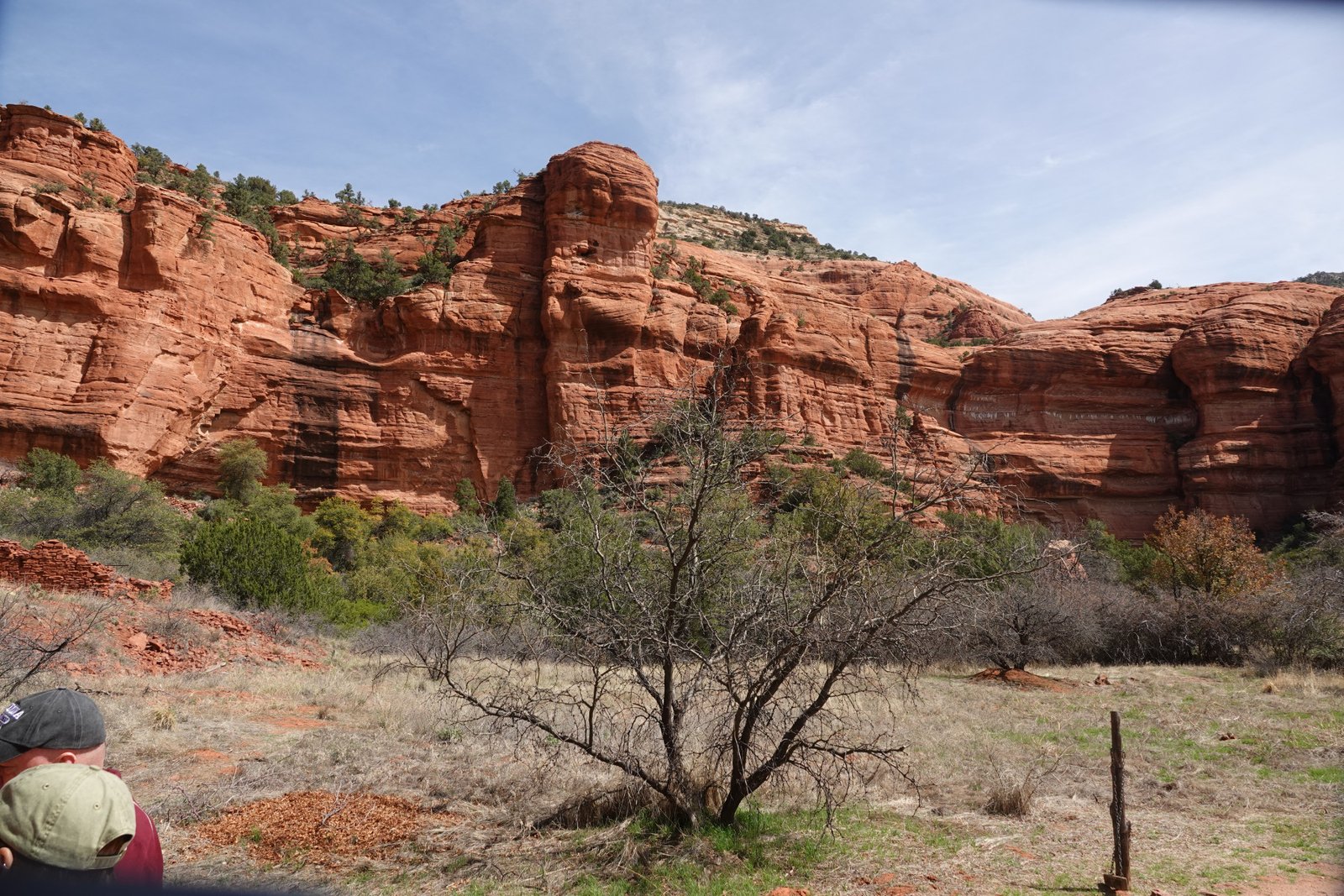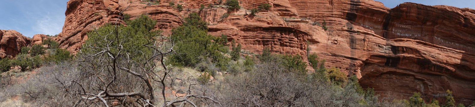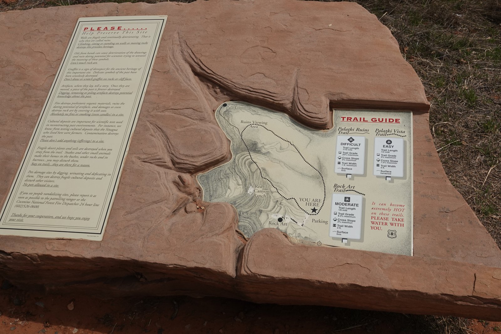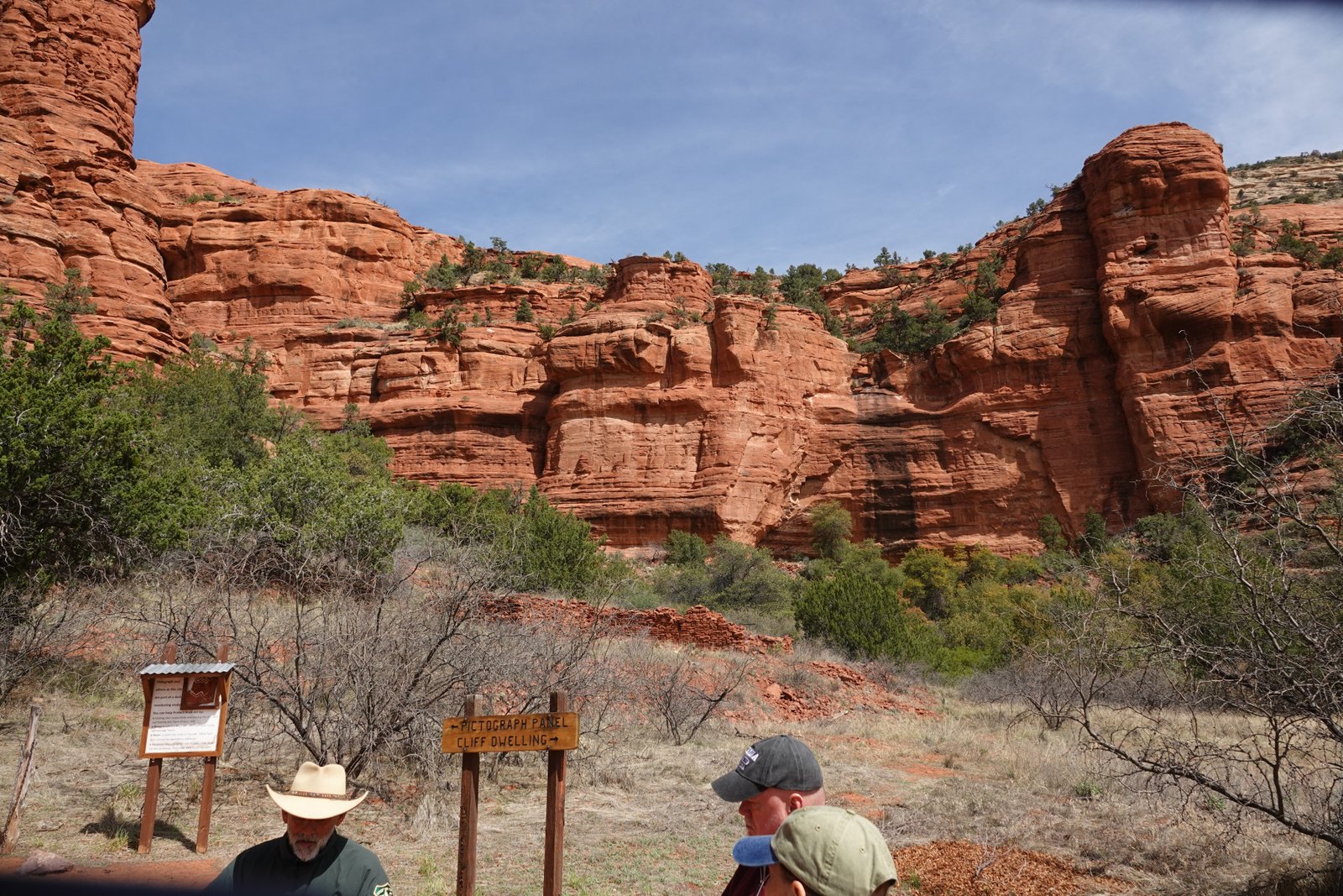 The Palatki Heritage Site is an archaeological site and park located in the Coconino National Forest, near Sedona, in Arizona, United States at approximately 34°54′56″N 111°54′08″W. In the Hopi language Palatki means 'red house'. Cliff dwellings The Palatki site has a set of ancient cliff dwellings in the red sandstone cliffs, built from 1100 to 1400 CE by the Sinagua people of the Ancestral Puebloans. The cliff dwellings were built under south-facing overhangs for shelter and winter sun. The Sinagua people planted crops and made pottery in the area.[1] Palatki and Honanki, another nearby archaeological site, had the largest cliff dwellings in the Red Rock formation area from 1150 to 1300 CE.[2] Palatki consists of two separate pueblos, suggesting two family or kin groups may have lived here, one in each pueblo. The circular shield-like pictographs above the eastern pueblo have been interpreted by some archaeologists as being a kin or clan symbol.[3] Rock art There are pictographs and petroglyphs at the Palatki site, including some that predate the cliff dwellings. Many of the pictographs on the rock walls are from the Sinagua. However, those created by peoples of the Archaic period in North America include some of the more abstract pictograph symbols and drawings that are 3,000 to 6,000 years old, and some of the petroglyphs, estimated to be 5,000 to 6,000 years old.[1] Archaeology Visitation to the site for over a century has caused degradation of the archaeological elements. It was begun by 19th century Euro-American settlers, with little archaeological awareness for the area. Photographs from the early 1900s show that an estimated 70 to 90 percent of the original structures have disappeared since then.