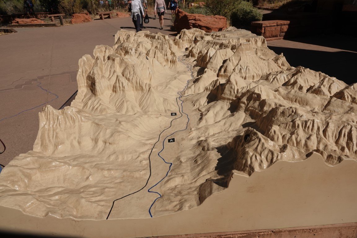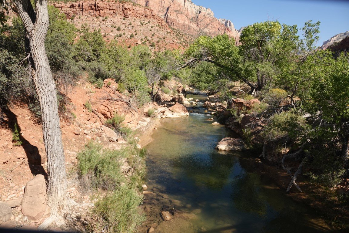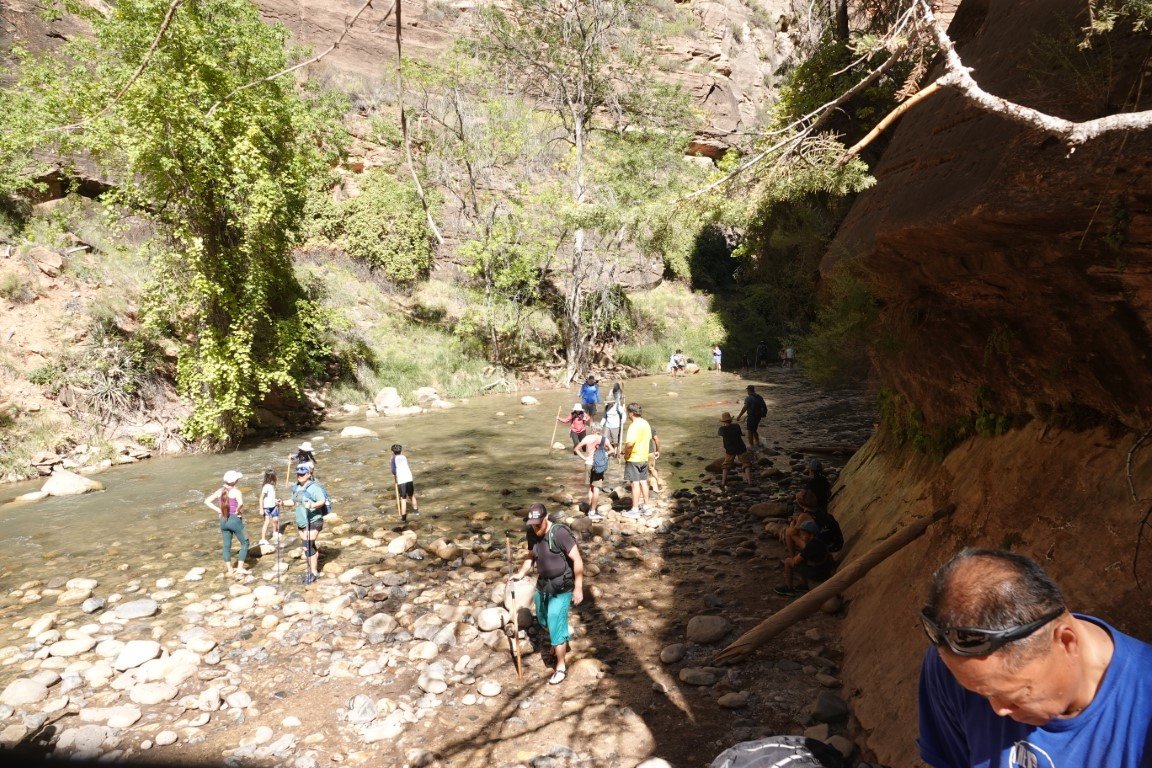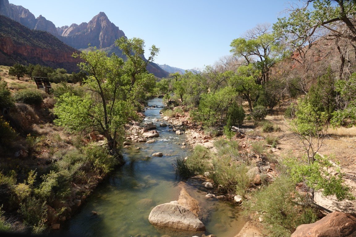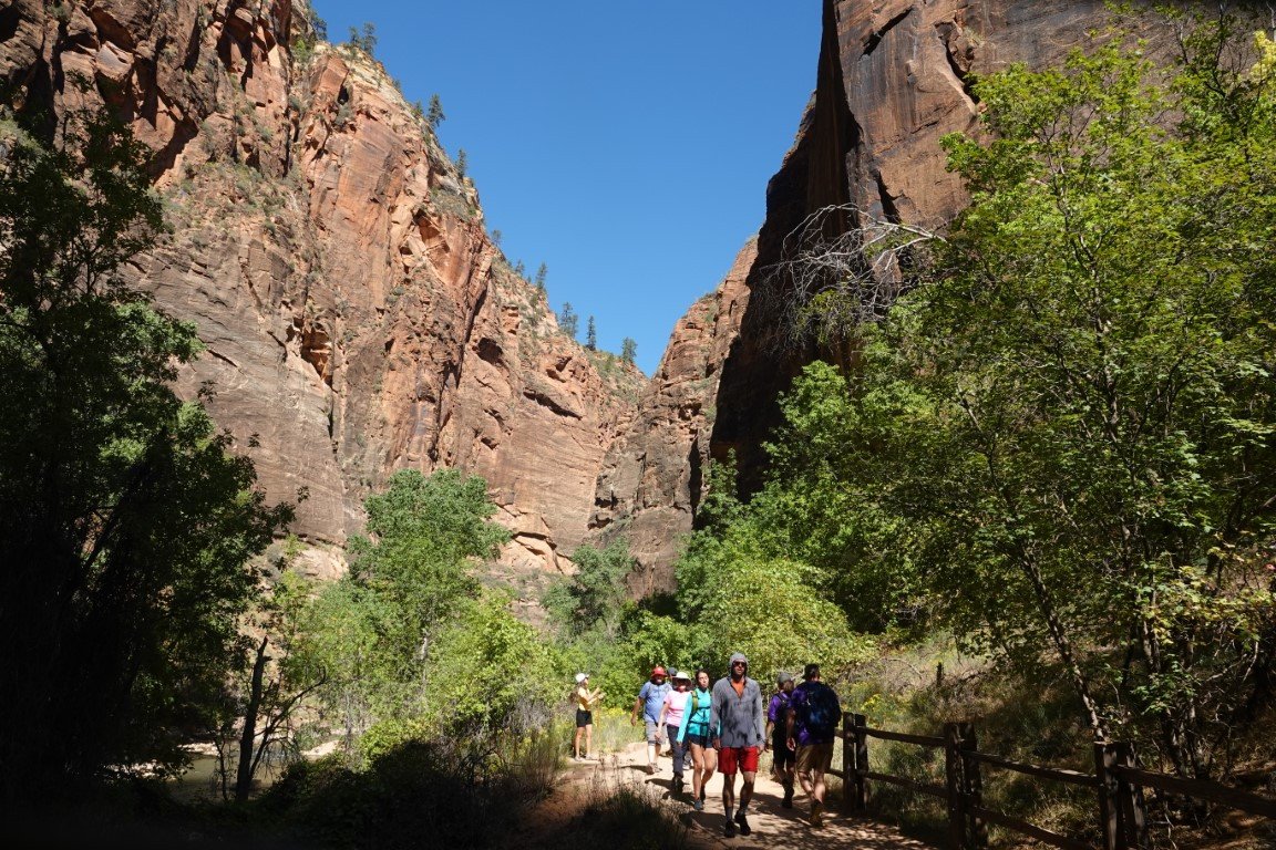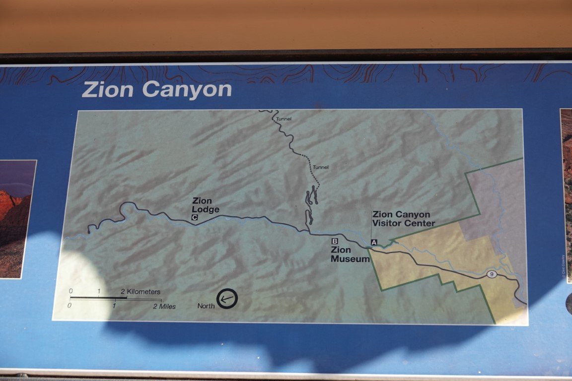 Zion National Park is a national park of the United States located in southwestern Utah near the town of Springdale. Located at the junction of the Colorado Plateau, Great Basin, and Mojave Desert regions, the park has a unique geography and a variety of life zones that allow for unusual plant and animal diversity. Numerous plant species as well as 289 species of birds, 75 mammals (including 19 species of bat), and 32 reptiles inhabit the park's four life zones: desert, riparian, woodland, and coniferous forest. Zion National Park includes mountains, canyons, buttes, mesas, monoliths, rivers, slot canyons, and natural arches. The lowest point in the park is 3,666 ft (1,117 m) at Coalpits Wash and the highest peak is 8,726 ft (2,660 m) at Horse Ranch Mountain. A prominent feature of the 229-square-mile (590 km2) park is Zion Canyon, which is 15 miles (24 km) long and up to 2,640 ft (800 m) deep. The canyon walls are reddish and tan-colored Navajo Sandstone eroded by the North Fork of the Virgin River. The park attracted 5 million visitors in 2023.